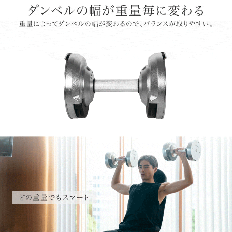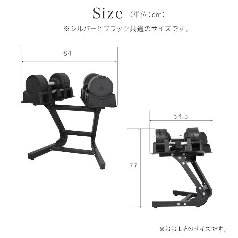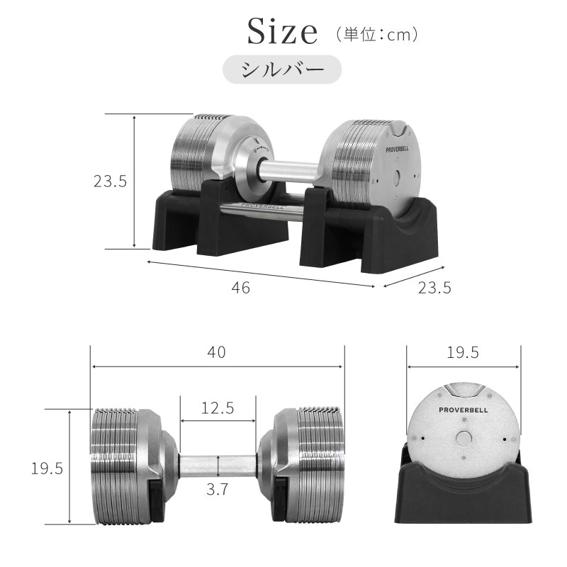 ダンベル1台(シルバー):W40.1cm × D19.3cm × H19.3cm(ダンベル) W46cm × D23.5cm × H13cm(台座)