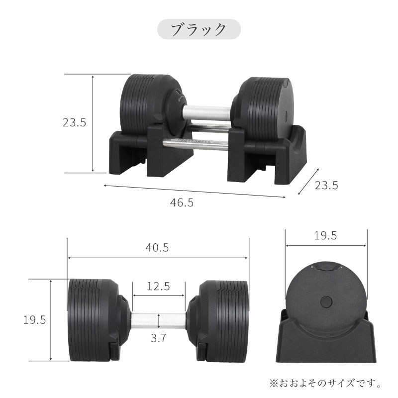 ダンベル1台(ブラック):W40.5cm × D19.3cm × H19.3cm(ダンベル) W46.5cm × D23.5cm × H13cm(台座)
