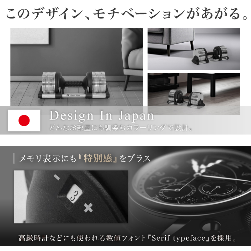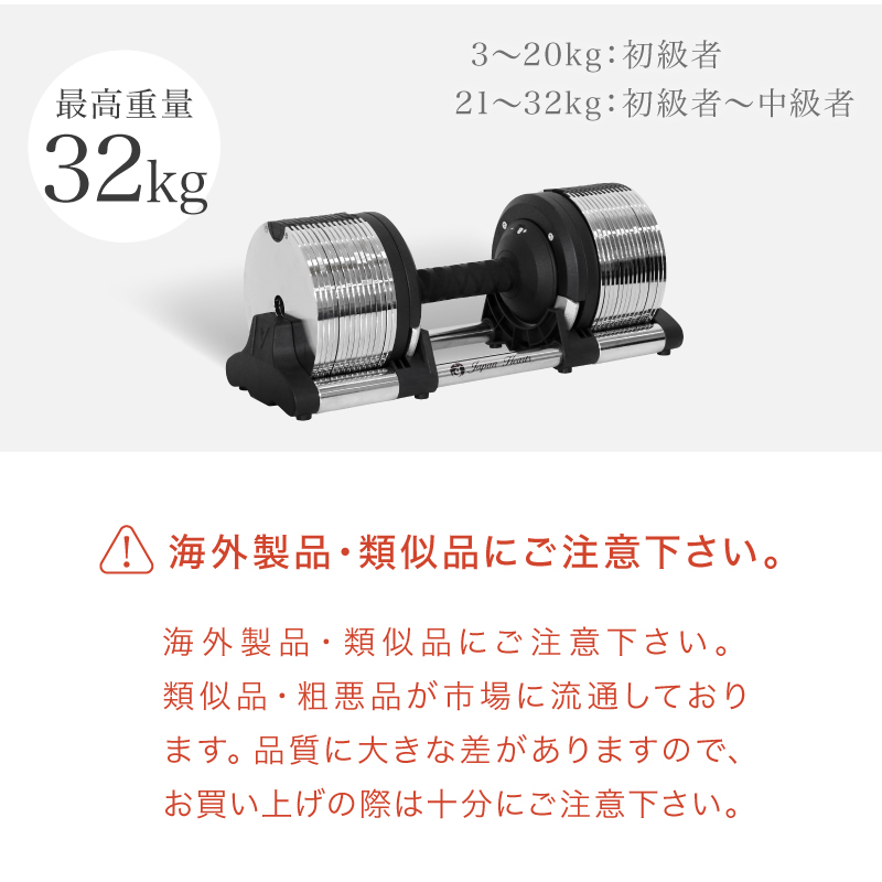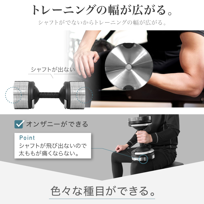 ・1kg刻みで調節できる ・重量誤差の少ない精密設計 ・グリップが握りやすい ・オリジナルデザイン ・カチャカチャいわない静音設計 ・バランスがとりやすい
